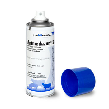Animedazon Spray 2.45% is used for the treatment of superficial traumatic or surgical wounds contaminated with chlortetracycline-sensitive in cattle, sheep and pigs. It's an evenly coloured blue spray that can be used during pregnancy.