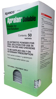| Dosage | Amounts to be administered and administration route Administration route: To be administered via the drinking water. Drinking systems should be clean and free of rust to avoid reduction of activity. In the case of calves it can be administered in milk or milk replacer. Amounts to be administered: Pigs: Administer 12,500 IU apramycin sulfate per kilogram of bodyweight (corresponding to 22.5 mg of product/kg bw), daily for 7 consecutive days. Calves: Administer 40,000 IU apramycin sulfate per kilogram of bodyweight (corresponding to 72 mg of product/kg bw), daily for 5 consecutive days. Chickens: Administer 80,000 IU apramycin sulfate per kilogram of bodyweight (corresponding to 144 mg of product/kg bw), daily for 5 consecutive days. Rabbits: Administer 20,000 IU apramycin sulfate per kilogram of bodyweight (corresponding to 36 mg of product/kg bw), daily for 5 consecutive days. The intake of medicated water depends on the clinical condition of the animals. In order to obtain the correct dose, the concentration of the veterinary medicinal product has to be adjusted accordingly. The weight of the animals should be determined as accurately as possible to avoid underdose. Medicated water should be the only source of drinking. Medicated water must be renewed every 24 hours. Medicated reconstituted milk replacer should be prepared immediately before use. Milk replacer should not exceed 40 |