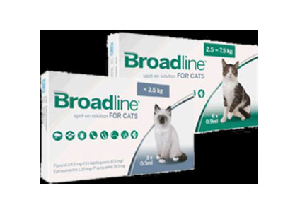 Target species Cats Indications for use For cats with or at risk from mixed infestations by cestodes, nematodes and ectoparasites. The veterinary medicinal product is exclusively indicated when all three groups are targeted at the same time. Ectoparasites - Treatment and prevention of infestations by fleas (Ctenocephalides felis). Elimination of fleas within 24 hours. One treatment prevents further infestations for at least one month. - Prevention of environmental flea contamination by inhibiting the development of flea immature stages (eggs, larvae and pupae) for over a month. - The product can be used as part of a treatment strategy for the control of flea allergy dermatitis (FAD). - Treatment and prevention of infestations by ticks (Ixodes ricinus). Elimination of ticks within 48 hours. One treatment prevents further infestations for up to 3 weeks. - Treatment of notoedric mange (Notoedris cati). Cestodes - Treatment of infestations with tapeworms (Dipylidium caninum, Taenia taeniaeformis, Echinococcus multilocularis, Joyeuxiella pasqualei (adult), and Joyeuxiella fuhrmanni (adult). Nematodes - Treatment of infestations with gastrointestinal nematodes (L3, L4 larvae and adults of Toxocara cati, adults of Toxascaris leonina, L4 larvae and adults of Ancylostoma tubaeforme and Ancylostoma ceylanicum, and adults of Ancylostoma brazilienze). - Treatment of infestations with feline lungworms (L3 larvae, L4 larvae and adults of Aelurostrongylus abstrusus), L4 larvae and adults of Troglostrongylus brevior). - Treatment of infestations with vesical worms (Capillaria plica). - Prevention of heartworm disease (Dirofilaria immitis larvae) for one month. Contra-indications Do not use in sick or convalescent animals. Do not use in rabbits. Do not use in cases of hypersensitivity to the active substances or to any of the excipients. Special warnings for each target species When applying the veterinary medicinal product, special attention should be paid in long hair breeds in order to ensure that it is applied directly to the skin and not on the hair, as this could lead to a lower bioavailability of the active substances and thus, to a reduced efficacy. No data on the effect of bathing/shampooing on the efficacy of the product in cats is available. However, brief contact of the animal with water on one or two occasions within the month following application is unlikely to significantly reduce its efficacy. As a precaution, it is not recommended to bathe animals within 2 days after topical treatment. After treatment with BROADLINE, ticks will generally be killed within 48 hours after infestation without having a blood meal. However, since the attachment of single ticks after treatment cannot be excluded, transmission of infectious diseases cannot be completely ruled out. Tapeworm infestation may reoccur unless control of intermediate hosts such as fleas, mice etc. is undertaken. In certain individual cats Notoedres cati infestation may be severe or complicated by bacterial infections. In these severe cases concomitant treatment may be necessary. Parasite resistance to any particular class of antiparasitic drug may develop following frequent use of a compound of that class. Therefore, epidemiological information about current susceptibility of the target species should be taken into account in order to limit the possibility of a future selection for resistance. Cats in areas endemic for heartworm, or those which have travelled to endemic areas, may be infected with adult heartworms. Although the veterinary medicinal product may be safely administered to cats infected with adult heartworms, no therapeutic effect against adult Dirofilaria immitis has been established. It is therefore recommended that all cats 6 months of age or more, living in areas endemic for heartworm should be tested for existing adult heartworm infestation before being treated with the product for heartworm prevention. Some cats with patent Joyeuxiella spp. infestation may nevertheless harbour a high proportion of juvenile worms, which are not susceptible to the product; therefore a post-treatment follow-up is recommended in case of such infestations. To reduce re-infestation from emergence of new fleas, it is recommended that all cats in a household be treated. Other animals living in the same household should also be treated with a suitable product. All stages of fleas can infest the cat’s basket, bedding and regular resting areas such as carpets and soft furnishings. In case of massive flea infestation and at the beginning of the control measures, these areas should be treated with a suitable environmental product and then vacuumed regularly. Special precautions for use in animals Spot-on application only. Do not inject, do not administer orally or via any other route. Avoid contact with the cat's eyes. It is important to apply the veterinary medicinal product to a skin area where the cat cannot lick it off: on the neck, in between shoulders. Avoid animals licking each other following treatment. Oral ingestion of the veterinary medicinal product resulted in common to uncommon vomiting, hyper-salivation and/or in transient neurological signs such as ataxia, disorientation, apathy and pupil dilation in safety studies. Muscle tremors have been reported in very rare cases based on post marketing safety experience. These signs usually resolve spontaneously within 24 hours. On very rare occasions, symptomatic treatment can be required. The safety of the veterinary medicinal product has not been tested at intervals of less than 2 weeks or in kittens weighing less than 0.6 kg and/or under 7 weeks of age. he product is not for use in kittens weighing less than 0.6 kg and/or under 7 weeks of age. The veterinary medicinal product is not intended for use in dogs. Some dog breeds may present increased susceptibility to macrocyclic lactones, potentially leading to signs of neurotoxicity. Oral uptake by dogs, specifically Collies, Old English