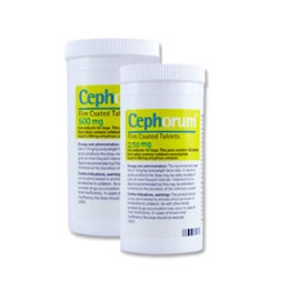 Cephorum Dog Tablets are white round tablets that are scored on one side. The tablets are not divisible. The active ingredient is Cephalexin. Cephorum film-coated tablets are 250mg in strength, available in a pack of 140.