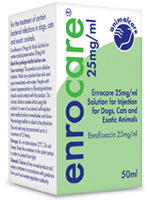 | Dosage | Amounts to be administered and administration route For administration by gavage or in drinking water. Dosage Owing to physiological and pharmacokinetic differences between the wide range of species for which this product is indicated, the dose rates below are for guidance only. Depending upon the species of animal and the infection to be treated, alternative doses may be appropriate using an evidence-based approach. However, any change in dosing regimen should be based on a benefit:risk assessment by the responsible veterinarian, as tolerance at higher doses has not been investigated. Pet rabbits and rodents:5 mg enrofloxacin per kg bodyweight (0.2 ml per kg bodyweight) orally diluted in water, twice daily for 7 days. Reptiles:5 mg enrofloxacin per kg bodyweight (0.2 ml per kg bodyweight) orally diluted in water, at 24-48 hour intervals for 6 days. Reptiles are ectothermic, relying on external heat sources to maintain their body temperature at the optimum level for correct function of all body systems. Metabolism of substances and activity of the immune system are, thus, critically dependant on the body temperature. Therefore, the veterinarian must be aware of correct temperature requirements of the respective reptile species and the hydration status of the individual patient. Furthermore, it has to be considered that large differences exist in the pharmacokinetic behaviour of enrofloxacin among different species, which additionally will influence the decision about the correct dosage of the veterinary medicinal product. Therefore, the recommendations made here can only be used as a starting point for individual dose setting. Ornamental birds:10 mg enrofloxacin per kg bodyweight (0.4 ml per kg bodyweight), orally diluted in water, twice daily for 7 days. Information on correct administration The undiluted veterinary medicinal product is strongly alkaline and, therefore, to avoid caustic effects, it is essential to dilute the product with at least 4 parts water prior to administration. In the case of smaller animals (weighing less than 500 g), it may be appropriate to dilute 0.1 ml of the neat product with >4 parts water and administer a proportion of the total volume. If the product is to be given via the drinking water, concentrations of between 50 and 200 ppm should be considered as suitable working dilutions; concentrations in excess of 250 ppm should be avoided as precipitation may occur. Medicated fluids should be made up immediately prior to provision on a daily basis. 20 ml bottle: A 3 ml syringe is provided with the 20 ml bottle for withdrawal of the product and facilitation of dilution prior to administration. This syringe has graduations of 0.1 ml. It is recommended to draw up a minimum of 0.1 ml of product prior to dilution since it is not possible to accurately measure volumes that are lower than this. 100 ml bottle: A 10 ml syringe is provided with the 100 ml bottle for withdrawal of the product and facilitation of dilution prior to administration. This syringe has graduations of 0.2 ml. It is recommended to draw up a minimum of 0.2 ml of product prior to dilution since it is not possible to accurately measure volumes that are lower than this. To withdraw product, firmly insert the syringe hub into the centre of the self-sealing syringe adaptor of the bottle and remove the required amount. To avoid inhalation of the medication, care should be taken with restraint of the animal and administration of the product. Overdose (symptoms, emergency procedures, antidotes), if necessary In cases of accidental overdose, digestive tract disorders (e.g. vomiting, diarrhoea) and neurological disorders may occur. There is no antidote and treatment should be symptomatic. |