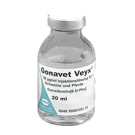| Dosage | 4.9 Amounts to be administered and administration route For intramuscular or subcutaneous injection. For intramuscular use, preferably in the neck region. The product is intended for single administration except when used as part of the “Ovsynch” timed artificial insemination protocol. Dosage in ml product and micrograms Gonadorelin[6-D-Phe] per animal. Cattle (cows and heifers) by intramuscular injection: 1.0 - 2.0 ml (corresponding to 50 – 100 micrograms of Gonadorelin[6-D-Phe]) - Ovulation induction in case of delayed ovulation due to LH-deficiency 2.0 ml - Induction/synchronization of ovulation within the framework of systems for timed inseminations 1.0 - 2.0 ml - Stimulation of the ovaries during the puerperal period from day 12 post partum 1.0 ml - Ovarian cysts (due to LH-deficiency) 2.0 ml Pigs (sows and gilts) by intramuscular or subcutaneous injection: 0.5 - 1.5 ml (corresponding to 25 – 75 micrograms of Gonadorelin[6-D-Phe]) - Induction/synchronization of ovulation within the framework of systems for timed inseminations and parturition synchronization Sows: 0.5 - 1.0 ml Gilts: 1.0 - 1.5 ml Horses (mares) by intramuscular injection: 2.0 ml (corresponding to 100 micrograms of Gonadorelin[6-D-Phe]) The rubber stopper of the vial may be safely punctured up to 25 times. Otherwise, automatic syringe equipment, or a suitable draw-off needle, should be used for the 20 ml and 50 ml vials to avoid excessive puncturing of the closure. Special information Cattle: For oestrus and ovulation synchronization and timed artificial insemination (AI) in cattle the so called “Ovsynch-procedure” was developed, which consists of the combined use of GnRH and PGF2α. The following timed AI protocol has been commonly reported in the literature: Day 0: Inject 100 micrograms of Gonadorelin6-D-Phe per animal (2 ml of the product) Day 7: Inject PGF2 or analogue (luteolytic dose) Day 9: Inject 100 micrograms of Gonadorelin6-D-Phe per animal (2 ml of the product) AI: 16 – 20 hours later, or at observed oestrus if sooner The Ovsynch-procedure may not be as efficacious in heifers as in cows. Pigs: The ovulation synchronization system includes the administration of Peforelin or PMSG after the end of oestrus synchronisation with Altrenogest in gilts or after the weaning in adult sows and two timed artificial inseminations. In adult sows the time table depends on the duration of the suckling period. The following procedures are recommended: Gilts* Adult sows** Induction of oestrus Peforelin 48 h or PMSG (eCG) 24 h - 48 h after last application of Altrenogest Peforelin or PMSG application 24 h after weaning Synchronization of ovulation Gonadorelin6-D-Phe 78 - 80 h after Peforelin or PMSG application Suckling period > 4 weeks: Gonadorelin6-D-Phe 56 - 58 h after Peforelin or PMSG application Suckling period 4 weeks: Gonadorelin6-D-Phe 72 h after Peforelin or PMSG application Suckling period 3 weeks: Gonadorelin6-D-Phe 78 - 80 h after Peforelin or PMSG application 1st AI 24 - 26 h after Gonadorelin6-D-Phe application 24 - 26 h after Gonadorelin6-D-Phe application 2nd AI 40 - 42 h after Gonadorelin6-D-Phe application 40 - 42 h after Gonadorelin6-D-Phe application * The preferred dose of Gonavet Veyx in gilts is 50 micrograms Gonadorelin[6-D-Phe]. However, the dose may be adjusted within the range of 50 - 75 micrograms to take into account farm-specific aspects or seasonal influences. The proposed time table should be strictly kept. ** The preferred dose of Gonavet Veyx in adult sows is 50 micrograms Gonadorelin[6-D-Phe]. However, the administration of 25 micrograms is also sufficient in case of sows with sow parity of more than 3 or during the mating period of September until May. The proposed time table should be strictly kept. 4.10 Overdose (symptoms, emergency procedures, antidotes), if necessary None known. |