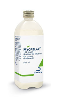 | Dosage | Amounts to be administered and administration route For intravenous administration by catheter: Dose: 100 mg guaifenesin per kg body weight per infusion equivalent to 100 ml solution per 100 kg body weight. Guaifenesin can be used in combination with different anaesthetics, as follows: Local anaesthetics for short procedures: Once the horse is properly sedated, guaifenesin is administered by rapid infusion until the animal lies down. A local anaesthetic should be used for painful procedures. Additional guaifenesin can be infused when the horse is recumbent, if needed. General anaesthetics: Induction and short term maintenance of anaesthesia: Pre-medication with an α2-receptor agonist (e.g. xylazine, detomidine, or romifidine) or acepromazine. If guaifenesin is to be administered with ketamine, pre-medication with one of the α2-receptor agonists is recommended. Guaifenesin is administered by rapid infusion until the animal begins to sway on its feet. At this stage either ketamine, thiopental or propofol is administered at a bolus dose. The duration of action of these combinations is variable depending on the animal and the other drugs administered. Surgical anaesthesia will be approximately 10-20 minutes duration and recumbency will be approximately 30-40 minutes duration. Maintenance of anaesthesia for medium duration procedures: Guaifenesin, administered by continuous IV infusion (50-100 mg/kg) at an infusion rate of approximately 1 ml/kg/h, can be used as part of total intravenous anaesthesia (TIVA) in combination with other injectable anaesthetics for procedures lasting up to 1 hour. Volatile anaesthetics: Guaifenesin can be used as adjunct to balanced anaesthesia using volatile anaesthetics for longer procedures. Guidance on anaesthetic protocols and dosages of individual veterinary medicinal products can be found in veterinary textbooks and scientific literature. For safe use with other pharmaceuticals, reference must be made to the relevant product literature. Overdose Doses greater than needed to obtain recumbency may result in significant respiratory depression. Signs of overdose, e.g. extensor spasms, occur at approximately twice the therapeutic dose. The lethal dose is four times the recommended treatment dose. |
