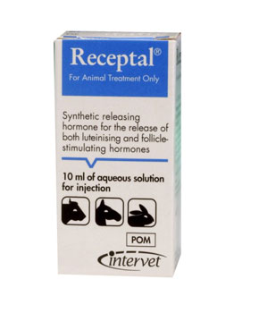 | Dosage | Amounts to be administered and administration route In cattle, horses and rabbits, the preferred route of administration is intramuscular injection (i.m.), but it may also be injected intravenously (i.v.) or subcutaneously (s.c.). In pigs, the preferred route of administration is intramuscularly (i.m.), but it may also be injected intravenously (i.v.). Do not pierce the stopper more than 12 times. When treating large numbers of animals, use a suitable draw-off needle or automatic dosing syringe to avoid excessive puncturing of the closure. Cattle: For the treatment of cows with fertility disorders of ovarian origin. Follicular cysts - with or without symptoms of nymphomania - 5.0 ml. In the treatment of follicular cysts in cattle, it is unnecessary to manually express the cysts. A corpus luteum will usually be clearly detectable on either the affected or the normal ovary within about 8 days after administration. At the same time luteinisation and disappearance of the cysts may occur. The response to treatment should be checked after 10-14 days. If no corpus luteum is present, or if newly formed cysts are detected, treatment should be repeated. Artificial insemination or service may take place during the first oestrus after treatment. On average this occurs 20 days after injection. Acyclia (true anoestrus) - 5.0 ml To determine that the cow is truly acyclic, two rectal examinations should be carried out with an 11 day interval between examinations. Alternatively, two samples of milk should be taken for milk progesterone assay with an 11 day interval between samples. Oestrus should occur 8-22 days after treatment. If oestrus has not been observed by this stage, a further rectal examination should be carried out. If there are no palpable structures on the ovaries, then treatment should be repeated. If, however, a corpus luteum is palpated, then prostaglandin F2α or one of its analogues should be administered, thus allowing the animal to return to oestrus 2-3 days later. Delayed ovulation - 2.5 ml. This condition may be treated at the time of artificial insemination or service, or up to 6-8 hours beforehand. Ovulation is usually induced within 24 hours of treatment. Improvement of pregnancy rate of cows - 2.5ml The product should be injected at the time of or up to 8 hours before hand. This helps to ensure that ovulation occurs at the correct time after insemination. Improvement of pregnancy rate may also be achieved by a single injection on day 11 or 12 after insemination by helping to prevent luteolysis and consequent embryo mortality. Note: The induction of ovulation is not possible in the presence of a functional corpus luteum. Cattle: For the synchronisation of oestrus in dairy cows. The product can be used as part of a 10-day GnRH/prostaglandin/GnRH oestrus synchronisation and insemination regime to increase submission rates and significantly reduce the calving to conception interval. The use of the product 7 days prior to prostaglandin increases the proportion of cows able to respond to the prostaglandin and co-ordinates a new follicular wave so more cows will ovulate during a shorter time after prostaglandin. A second Receptal treatment after the prostaglandin further tightens synchrony of ovulation in relation to the service time. The Intervet GnRH/prostaglandin/GnRH regime (Intercept™) for breeding dairy cows at a pre-planned time without the need for specific heat detection is summarised below: Day 0 Receptal (2.5 ml) Day 7 Prostaglandin (at luteolytic dose) Day 9 Receptal (2.5 ml) 54-56 hours post prostaglandin or at AI if sooner Day 10 AI 72 hours post prostaglandin or at observed heat if sooner. When using the Intercept fixed time insemination regime, it is recommended that cows showing signs of oestrus after prostaglandin treatment should be inseminated when observed in oestrus rather than completing the synchronisation programme. Trials have shown that for cows holding to their first service, use of a GnRH/prostaglandin/GnRH regime can improve the calving to conception interval by 11 days when compared to controls. When including all services, the calving to conception interval was shown to be improved by 7 days. Horses: For the treatment of mares. To induce ovulation of a mature follicle and thereby to synchronise ovulation more closely with mating - 10ml. The product should be administered on the first day on which the follicle has reached its maximum size, this being determined by previous clinical history and rectal examinations. The product is best given approximately 6 hours prior to service. This may be achieved by administering in the morning with service in the afternoon of the same day or alternatively, with the injection given in the early afternoon and service in the evening. The mare should be served again the next morning if she is still in oestrus. If ovulation has not occurred within 24 hours after treatment, then the injection should be repeated. Pigs (gilts): Induction of ovulation after oestrus synchronisation in order to facilitate a single fixed time artificial insemination programme:10 μg(2.5 ml)/animal. Fixed time insemination should be carried out as follows: -Administration of Receptal 115-120 hours after the end of synchronisation treatment with a progestin. -A single artificial insemination 30-33 hours after Receptal administration. Rabbits: Induction of ovulation for post-partum insemination - 0.2 ml. Administer 0.2 ml subcutaneously, 24 hours after parturition. Insemination should be carried out directly after administration. Improvement of conception rate - 0.2 ml. Inject 0.2ml at the time of insemination or mating. Rainbow trout: To facilitate stripping in male and female fish in spawning condition, and to reduce mortality due to egg binding. Inject at a dose rate of 0.75-1.0 ml per kg body weight (3‑4 micrograms Buserelin/kg body weight) by intramuscular injection, 2 cm above the lateral line posterior to the dorsal fin. Stripp